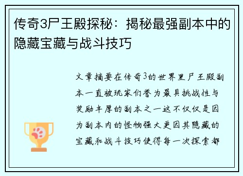 传奇3尸王殿探秘:揭秘最强副本中的隐藏宝藏与战斗技巧